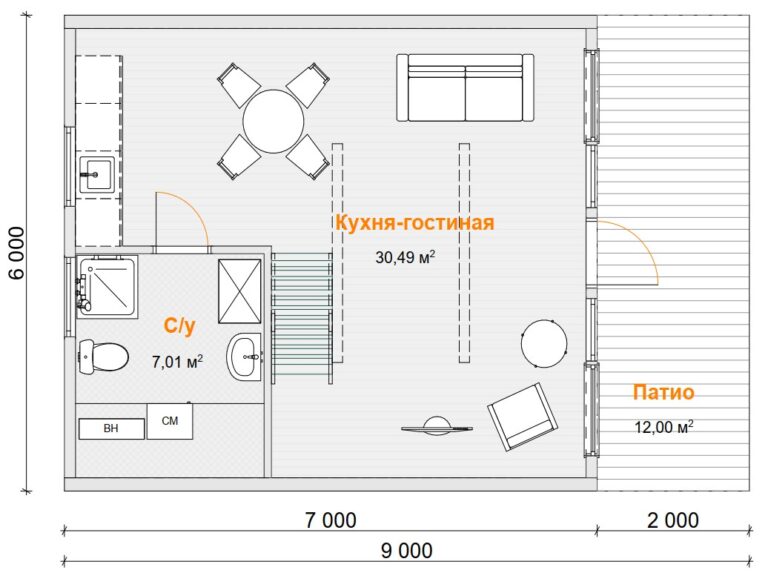 • Многофункциональная гостиная с кухонной зоной