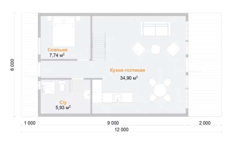 • 1-й этаж (48,2 м²): Просторная гостиная-кухня с умным хранением + санузел с душевой.